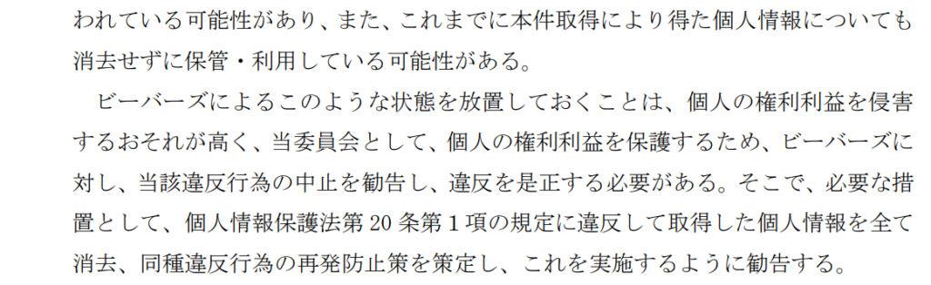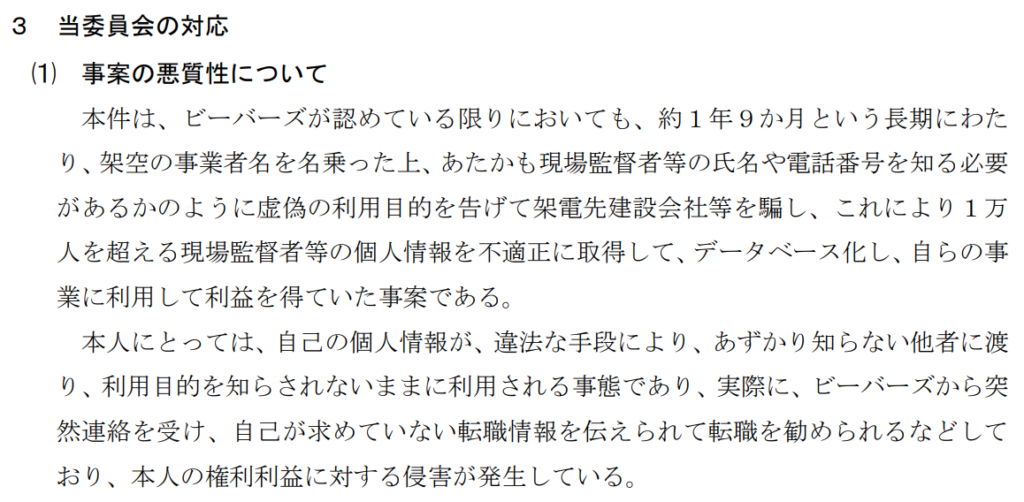 個人情報保護委員会がなぜ行政指導としての勧告まで行ったかというと、以下のとおり、ビーバーズによる個人情報の不正取得について「悪質」と判断したからです(以下、個人情報保護委員会の勧告資料からスクショ・引用)。
