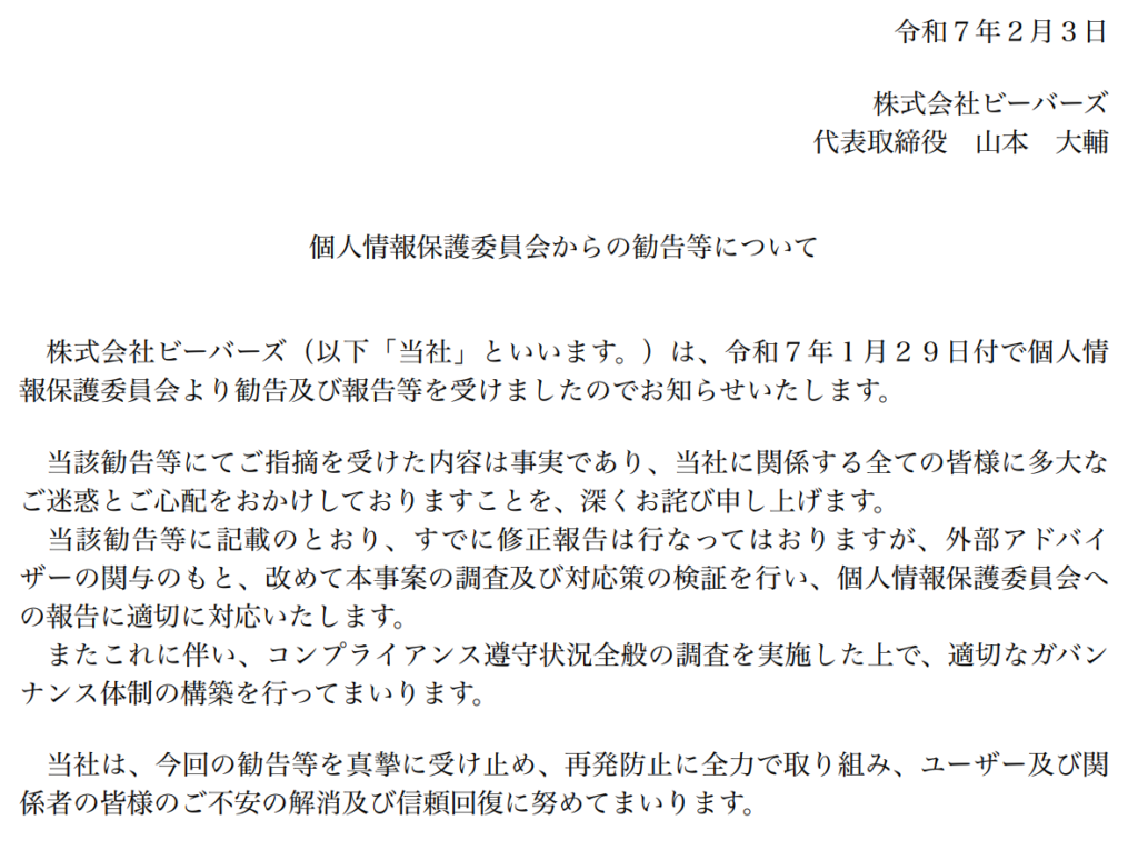ビーバーズは勧告を受けて2025年2月3日、代表取締役名義で、上記事情にて指摘したとおり既に修正報告済みであることに加え、個人情報保護委員会への報告に適切に対応する、適切なガバナンス体制の構築を行う、との声明を発表しましました。