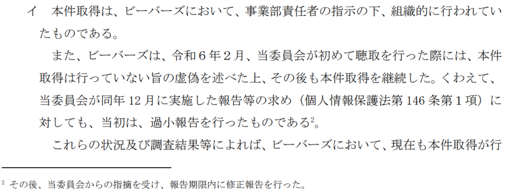 - 個人情報保護委員会が2024年2月に聴取した際に「不正取得を行っていない」と虚偽を述べ、不正取得を継続し、かつ、2024年12月に報告を聴取した際にも当初、過少報告をした(その後修正報告した)