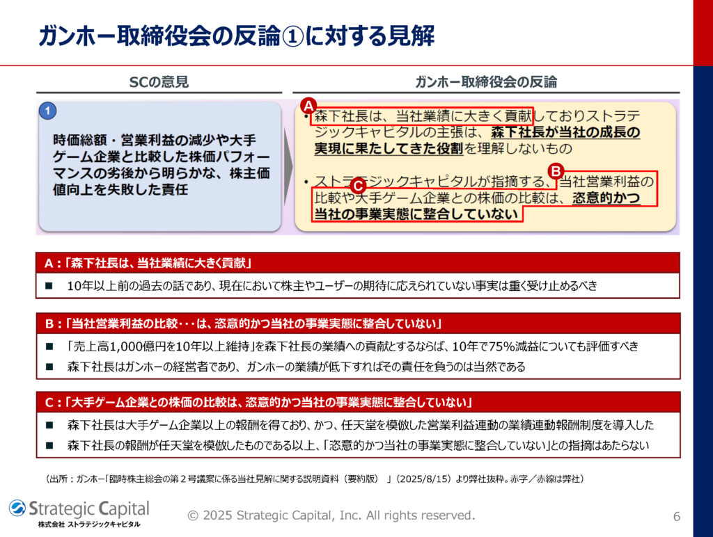 ベースになっているパワーポイントはガンホーが公表したもので、ページ見出しの「ガンホー取締役会の反論①に対する見解」と、パワーポイント中の赤字で書かれているA、B、CがSCが主張している部分です。