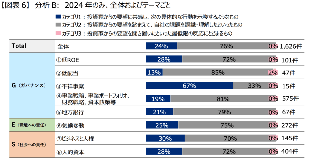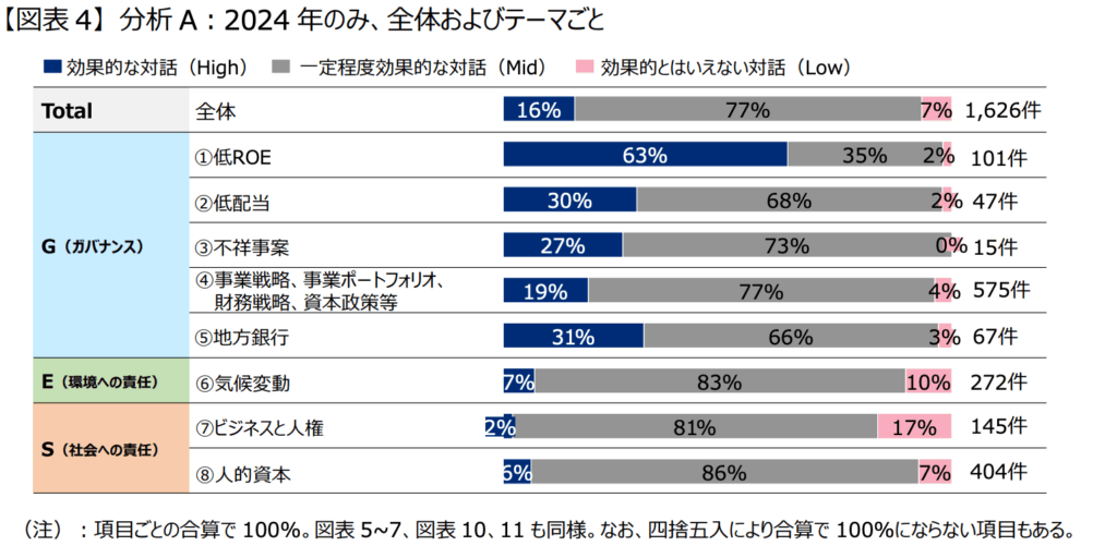 2024年の対話の質を見ると、これらのE/Sテーマにおいて「効果的な対話(High)」と判定された割合は、わずか 2% から 7% にとどまっています。これは、「低ROE」(63%)など、かねてより注力されてきた財務・ガバナンス関連のテーマと比較すると、相当に低い水準です。