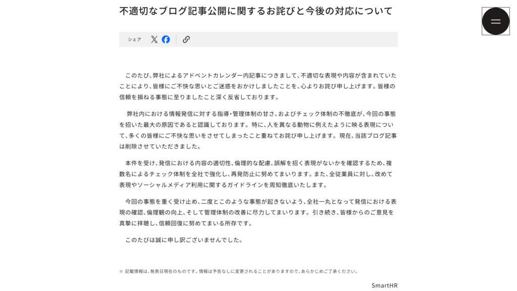 SmartHRは2025年12月8日、「不適切なブログ記事公開に関するお詫びと今後の対応について」とする謝罪文を公表しました。