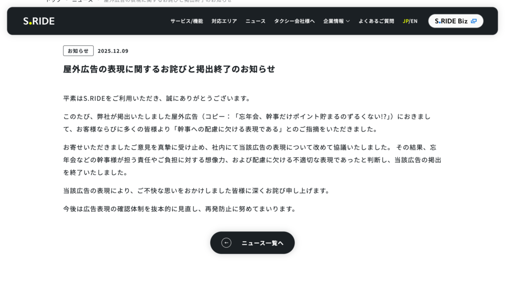タクシー配車アプリのS.RIDEは2025年12月9日、「屋外広告の表現に関するお詫びと掲載終了のお知らせ」とする謝罪文を公表しました。